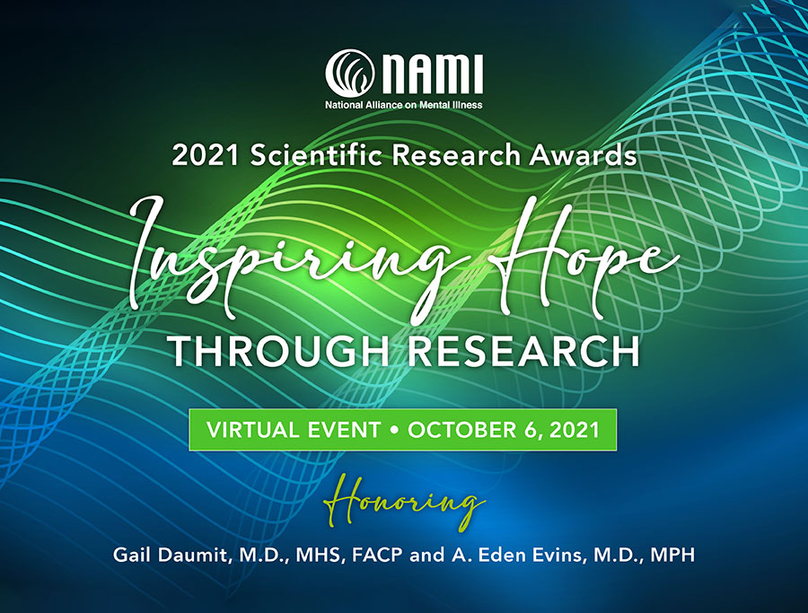 NAMI is pleased to announce that Gail Daumit, M.D., MHS, FACP, and A. Eden Evins, M.D., MPH, will receive the NAMI 2021 Scientific Research Award for their tireless work in the mental health field at the Inspiring Hope Through Research virtual event on Oct. 6, 2021.