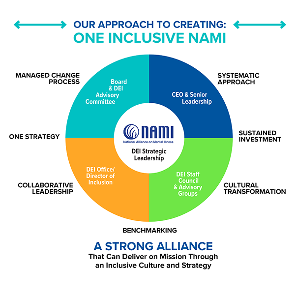 At NAMI, we believe a diverse, inclusive and equitable organization (or Alliance) is one where all employees, volunteers and members — regardless of gender, race, gender identity, ethnicity, national origin, age, sexual orientation, education, disability, veteran status or other dimension of diversity — feel valued and respected.