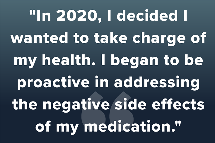 In 2020, I decided I wanted to take charge of my health. I began to be proactive in addressing the negative side effects of my medication. I learned that my eye movements could be resolved with eye muscle therapy. I started making healthier food choices and focusing on my physical well-being. Instead of eating sweet or salty junk food in my spare time, I would find intellectually stimulating or nourishing activities to do, like reading or sipping tea.