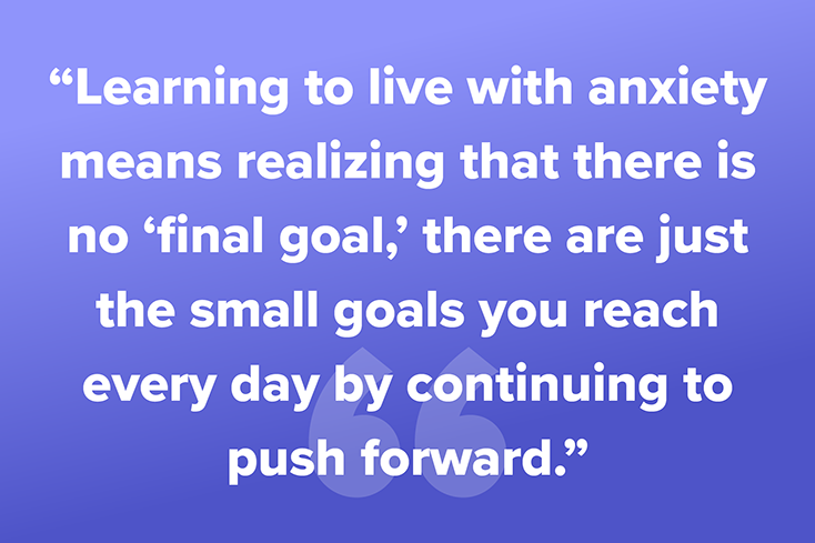 I wish I could share exactly how I recovered from my anxiety — but that’s not the wisdom I have to share. What I can say is this: learning to live with anxiety is a big part of realizing that there is no “final goal,” there are just the small goals you reach every day by continuing to push forward. If that nonexistent ending can resonate with just one person, my story is worth sharing.