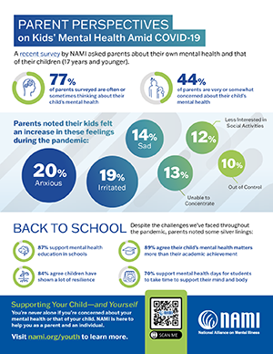This poll was conducted by Ipsos on behalf of NAMI between Nov. 9–17, 2021, using the KnowledgePanel®. It is based on a representative sample of 1,010 U.S. adults (ages 18 and over), who are parents to children 0–17 years old. The margin of sampling error is plus or minus 3.5 percentage points at the 95% confidence level.