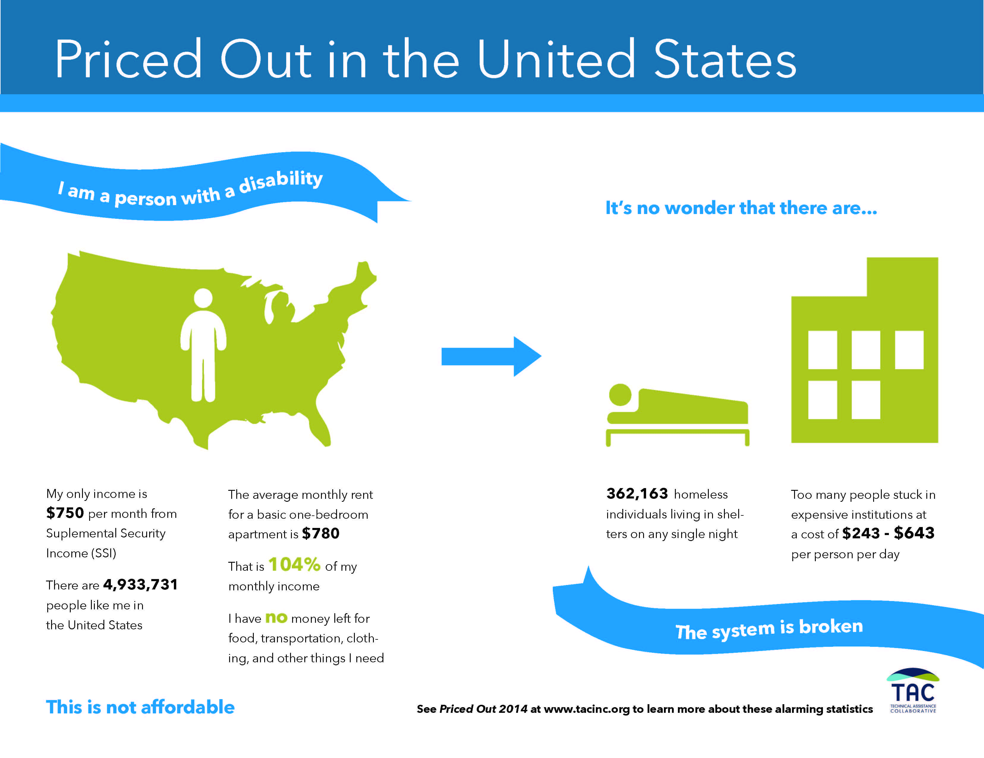 Earlier this week, the Technical Assistance Collaborative and the Consortium for Citizens With Disabilities (CCD) Housing Task Force released an important report showing the huge difficulties faced by people with disabilities including mental illness in getting affordable rental housing. The report, Priced Out in 2014, compares Supplemental Security Income (SSI) to fair market rents in housing markets across the country. A fairly obvious point made for anyone who relies on SSI for basic needs or has family members that do–nowhere in America are SSI benefits enough to rent your own apartment.