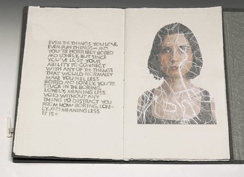 I admit that I was taken aback by the exhibit. Staff welcomed me into the space, and I was given a quick overview of the different pieces of art I would experience: There were 3D and 2D pieces as well as more intricate art installations, all of which really pulled at me. On a personal note, I’ve watched loved ones battle “invisible” illnesses, and even lost friends to suicide, so the artwork deeply resonated with me—some of it in ways I didn’t anticipate.