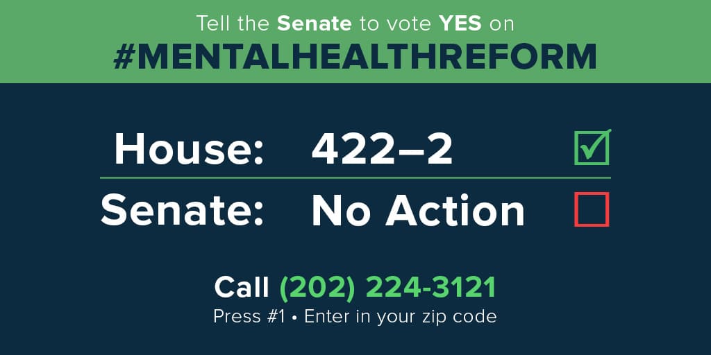 Here's our suggested message: "As a constituent of the Senator’s, I would like him/her to demand a vote on S. 2680, the Mental Health Reform Act. The House passed Mental Health Reform 422-2. The Senate should act. There is a mental health crisis in this country. This bill will help. Thank you."