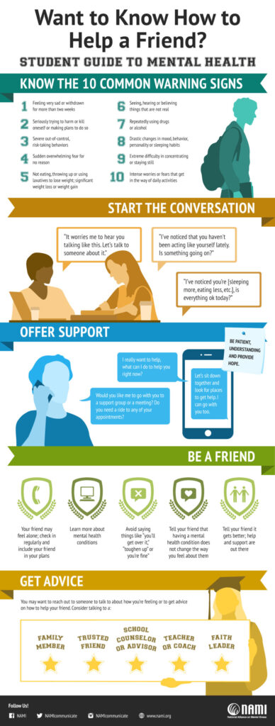 It can be challenging to know how to react when you notice a friend exhibiting signs of a mental health condition.It's important first to be able to recognize those warning signs and to then be able to talk with your friend about their situation in a way that is comfortable for them. NAMIhas created thisinfographicto highlight a few steps you should follow in order to help a friend that is going through problems with their mental health.