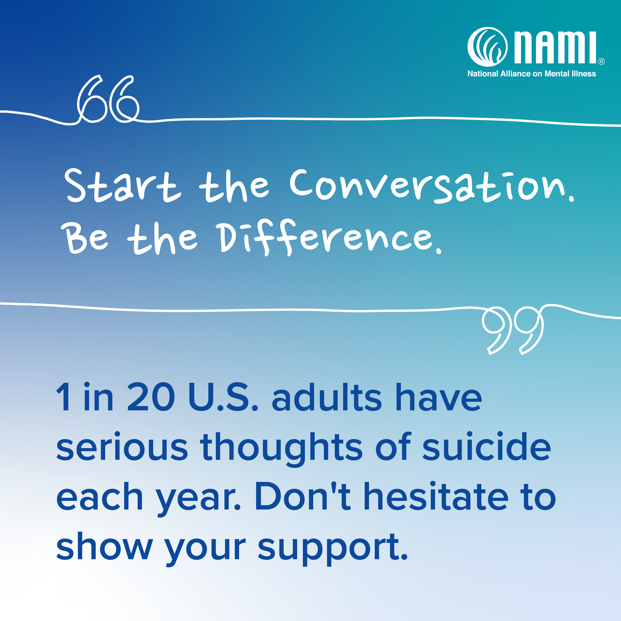 Talking about suicide isn’t harmful — silence is. One honest, caring conversation can save a life. Start a conversation. Be the difference. Learn more at nami.org/spm #SuicidePreventionMonth