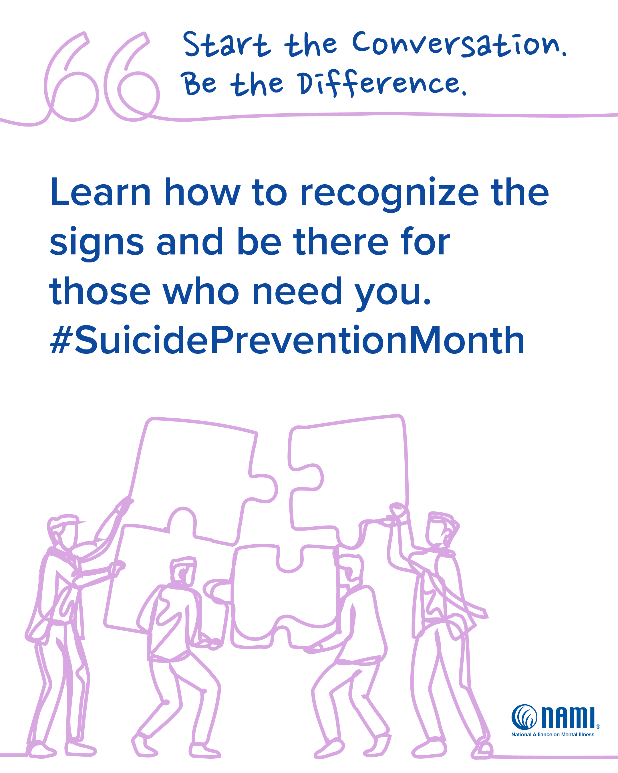 We at NAMI have created this toolkit to support NAMI State Organizations and Affiliates, partners, and mental health advocates across the country in raising awareness during Suicide Prevention Month.