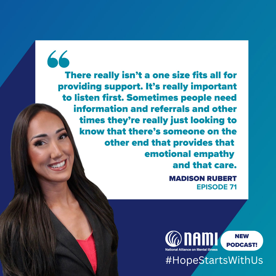 You know what, Madison? Thank you for sharing that. And, I also want to say thank you to your mom. You know, NAMI was started by moms in 1979, and moms are incredible advocates. And as you mentioned, your freshman year and your mom making the call, you know, I hope your mom listens to this. Thank you, Mom.