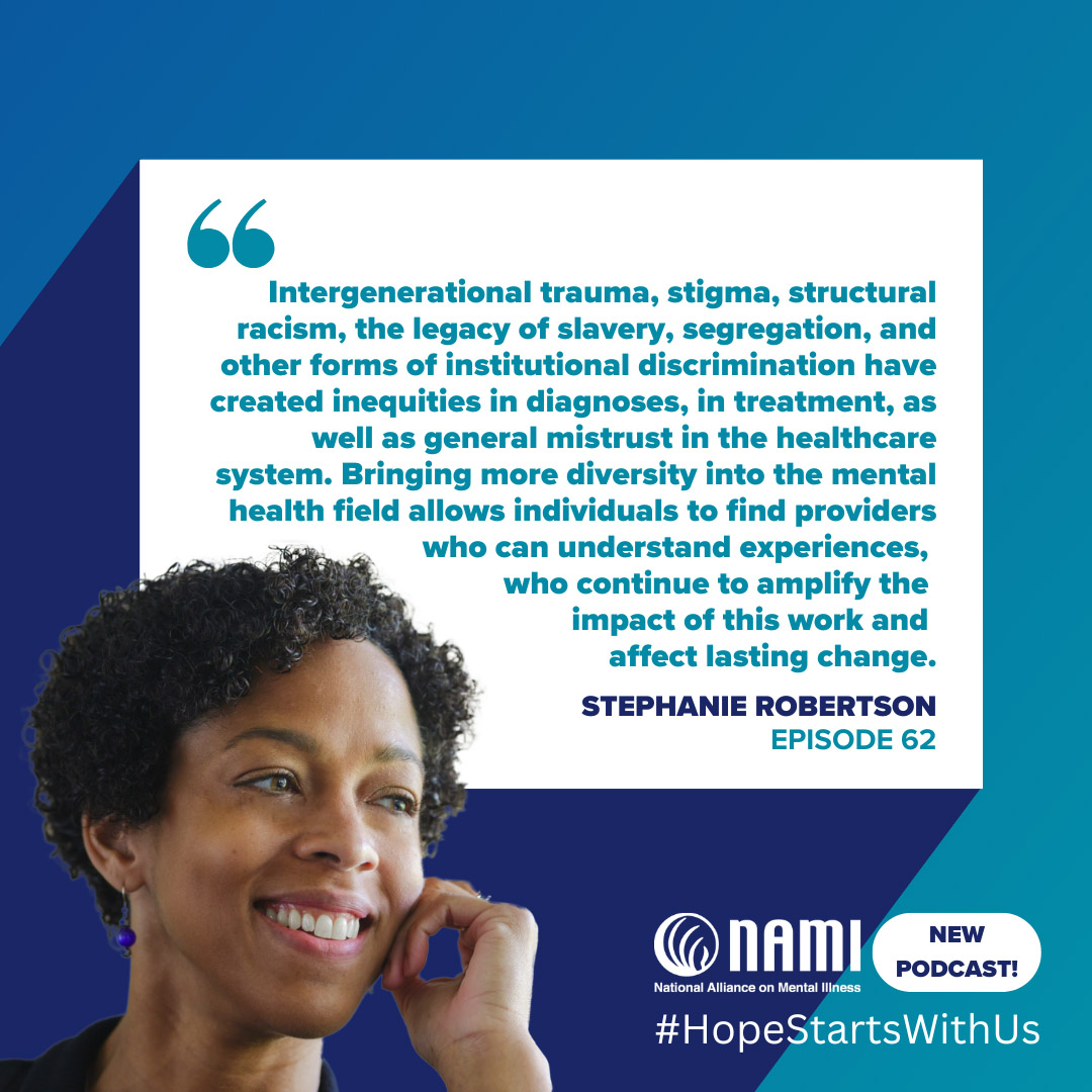 First of all, thank you so much, Darcy, for having me today to speak on this important topic, especially in recognition of Black History Month. This is my first podcast, and it's great to be able to share this experience with my new amazing boss while discussing an issue that deeply matters. My name is Stephanie Robertson and I am the new Director of Mental Health Equity Innovation with NAMI.