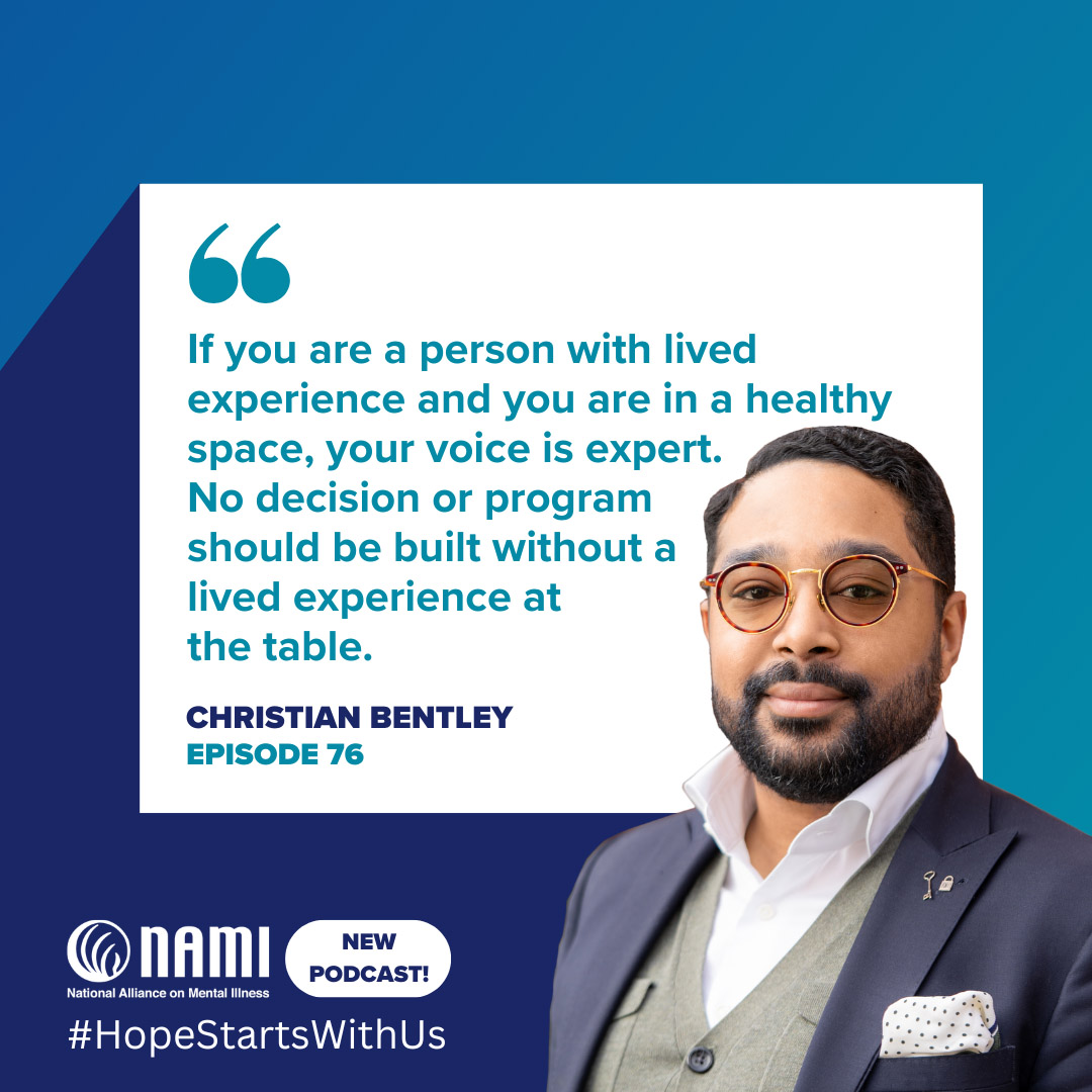 The relationship someone has with their faith community can have a big impact on their mental health journey. In this episode, NAMI CEO Daniel H. Gillison, Jr. and Christian Bentley discuss how Christian’s Catholic faith and community have helped him navigate the bipolar 1 disorder diagnosis he received. Their conversation explores how self-acceptance and how inclusion, compassion, and care contribute to how he manages his own mental health – and how these values could help others on their journey, too.