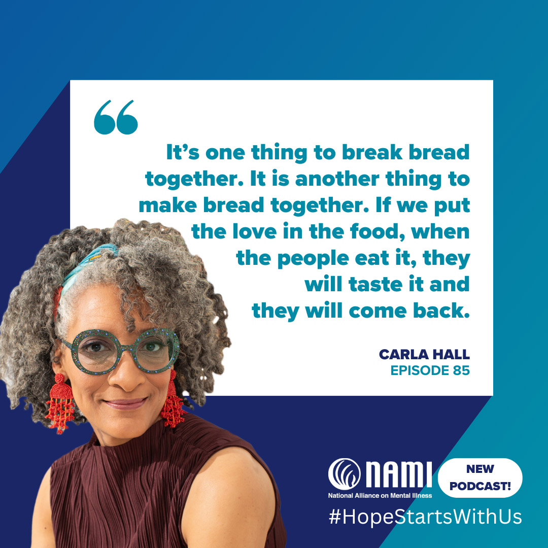 Every one of us has taken solace in “comfort food” before and knows how much what we eat can impact our moods. In this episode, NAMI CEO Daniel H. Gillison, Jr. speaks with Carla Hall, a chef, host, and author. After recently participating in an episode of Celebrity Family Feud benefitting NAMI, Carla joined Dan to talk about her mental health journey and current projects, as well as how food can support mental well-being and keep memories alive.