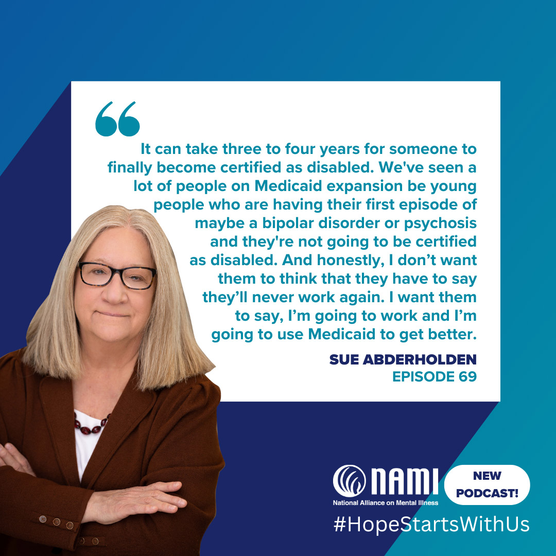 In this episode, NAMI’s Chief Advocacy Officer Hannah Wesolowski guest hosts a special episode about Medicaid’s importance for the mental health community. Hannah is joined by NAMI Minnesota Executive Director Sue Abderholden and NAMI’s Director Public Policy, Anita Burgos. Together, they discuss the potential changes to federal Medicaid funding, what Medicaid is and why it’s so crucial, how federal funding cuts could impact states, and options for listeners to get involved and advocate for Medicaid and the mental health community.