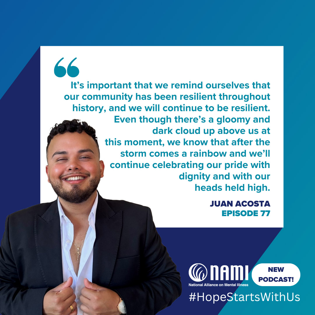 In this episode recognizing Pride Month, NAMI CEO Daniel H. Gillison, Jr. is joined by Juan Acosta, a mental health advocate and LGBTQI+ activist. During this conversation, the group explores Juan’s mental health journey, how he mixes mental health and LGBTQI+ advocacy, what change he hopes to see, and what’s next for him. They also discuss the California legislature recognizing Juan as a 2025 Pride Month honoree in 2025.