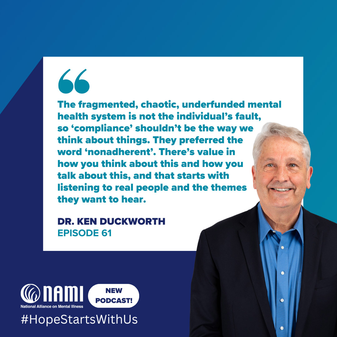 In 2023, NAMI produced the Schizophrenia and Psychosis Lexicon Guide. In this episode, NAMI CEO Dan Gillison, Jr. is joined by Chief Medical Officer Dr. Ken Duckworth to explore why the language we use to talk about schizophrenia and psychosis matters. Throughout their conversation, listeners will learn about the impact using empathetic language can benefit individuals living with schizophrenia and psychosis, as well as how this guide can support the cultural shift away from mental health stigmas.