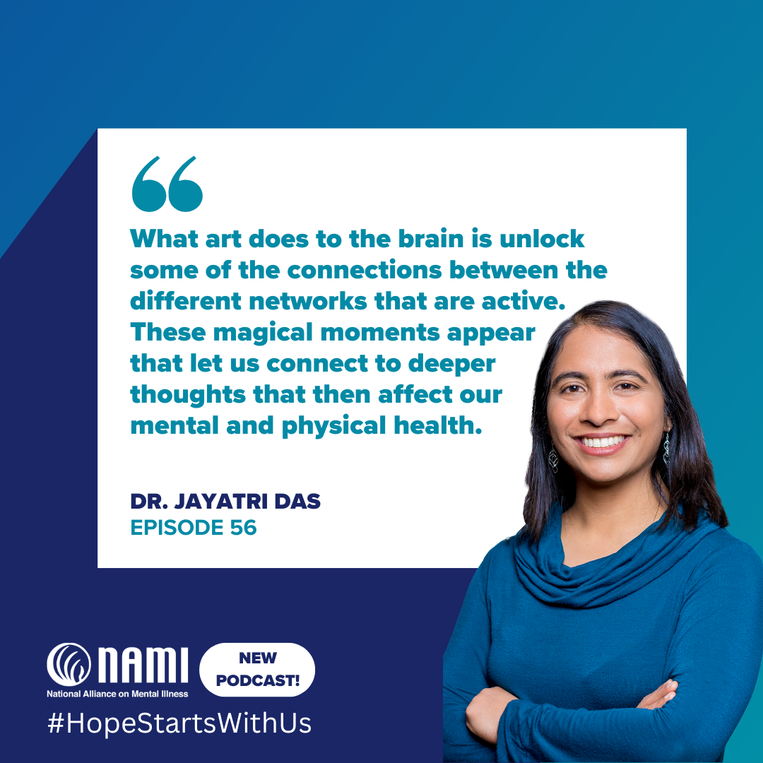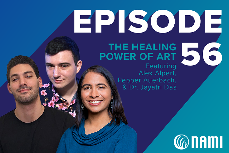 Art can help us process past experiences, explore our emotions, and expand our perspectives. In this episode, NAMI CEO Dan Gillison is joined by NAMI Ambassadors and artists Alex Alpert and Pepper Auerbach, as well as The Franklin Institute’s Jayatri Das. Together, they discuss how art impacts mental health, as well as the connection between physical and mental health. Alex and Pepper will have artwork presented in The Franklin Institute’s upcoming exhibition, “Body Odyssey,” in part about how science can help all of us find balance in our mental and physical health.