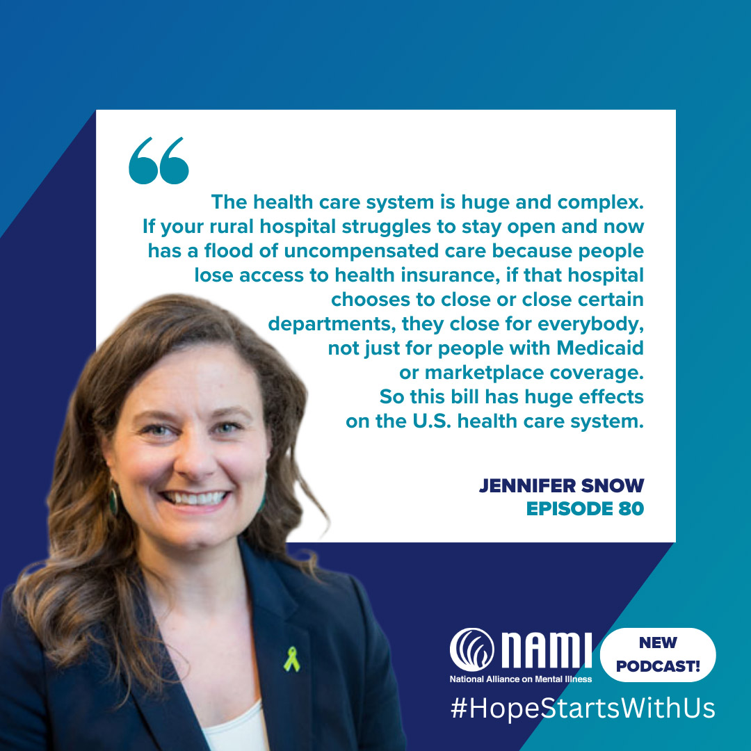In this follow-up conversation about Medicaid and mental health advocacy, NAMI’s Chief Advocacy Officer Hannah Wesolowski discusses Medicaid cuts and advocacy opportunities with Jennifer Snow, NAMI’s National Director of Government Relations and Policy. Listeners will hear their expert opinions on how Medicaid cuts just passed by Congress will impact people with mental health conditions and their families, policies NAMI will be monitoring, how supporters can stay involved, and more. Plus, hear from Hannah and Jen about the third anniversary of the 988 Suicide and Crisis Lifeline and NAMI’s recent public opinion polling about 988.
