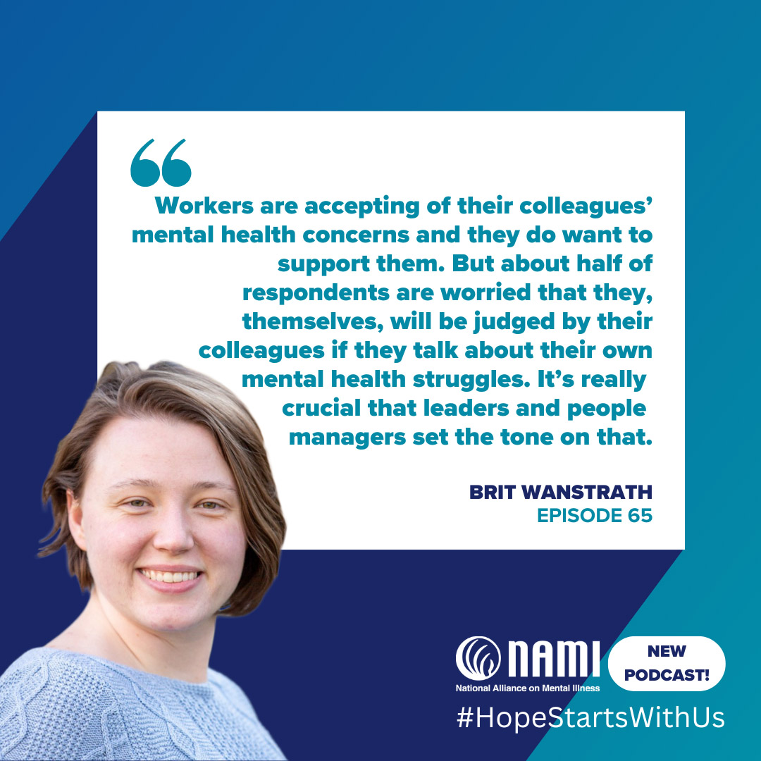 NAMI released our second poll about workplace mental health on February 27. The poll was conducted in partnership with Ipsos and highlights key findings for employees’ mental health at work. NAMI’s Chief Innovation Officer Darcy Gruttadaro serves as our guest host in discussion with Brit Wanstrath, NAMI’s Manager of Workplace Mental Health Initiatives. In this episode, the pair will discuss the poll’s four key findings, stigma surrounding mental health at work, and how employers can best support their workforce.