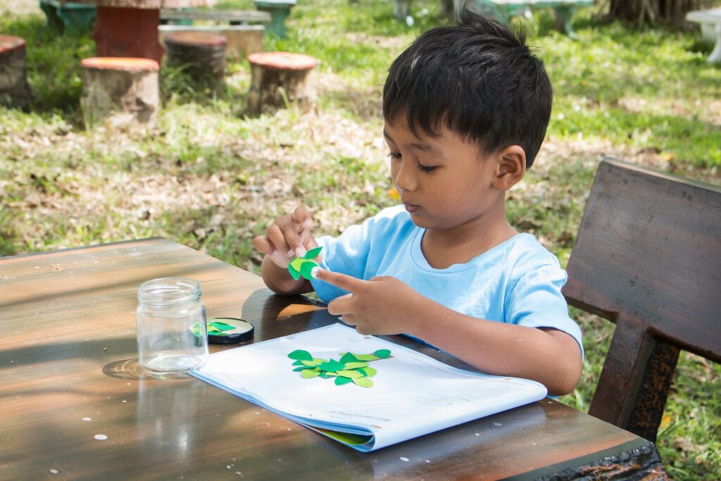 - Cutting or tearing and pasting pictures. This activity will require supervision for younger kids. Have your child take different colored papers, cut out the shapes they want, and glue them to one piece of paper to create an image.