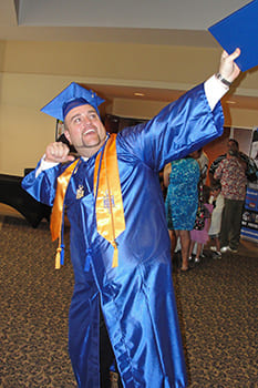 Justin Shea after graduating with his degree in music“I would start working, trying new things; and the staff would engage me, and that would give me something to look forward to,” Justin says. “I’d get home and have a decent conversation—an intelligent conversation—with my parents. Before, I couldn’t even finish a sentence.”