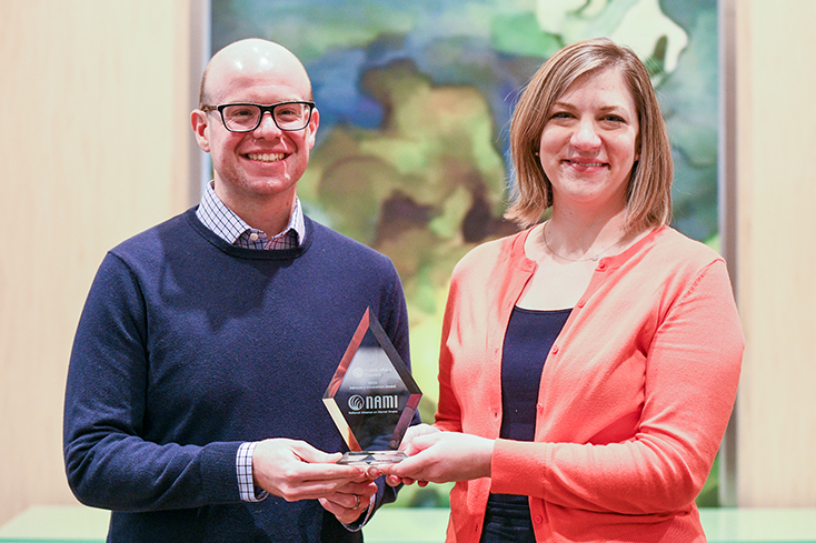 NAMI Advocacy Director Brandon Graham and NAMI Chief Advocacy Officer Hannah Wesolowski accept the Communications Innovation Award from the Public Affairs Council.