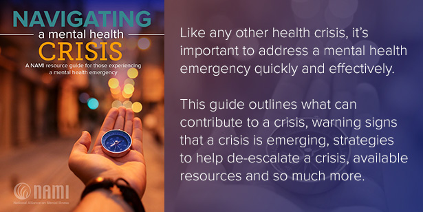NAMI is proud to release “Navigating a Mental Health Crisis: A NAMI Resource Guide for Those Experiencing a Mental Health Emergency.” NAMI developed this guide to support people experiencing mental health crises and their loved ones.