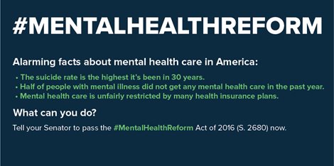 #Mentalhealth care is denied at 2x’s the rate of other care. #MentalHealthReform will help. Tell the Senate to pass S. 2680 now.