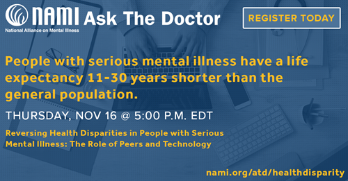 Watch, learn and engage on the upcoming NAMI Ask the Doctor Webinar featuring Dr. Stephen Bartels. Join us on Nov. 16 at 5:00 p.m. EDT to learn about current research on the causes of and potential solutions to one of our nation’s greatest health disparities.