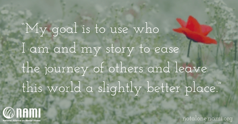 As part of my recovery, I learned as much as I could about schizophrenia, which further deepened my compassion for those with mental health conditions and their loved ones. I now speak about the resources available from NAMI at a local hospital and teach the NAMI Family-to-Family class. I also support and volunteer for several other mental health agencies, which help to provide housing for those with disabilities. My goal is to use who I am and my story to ease the journey of others and leave this world a slightly better place. Partnering with NAMI, we can and we will.