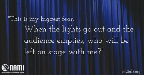 A student I work with asked me once what my biggest fear was. It wasn’t until that moment that I realized the thing I fear now above all other things is being abandoned. I didn’t realize how terrified I am that my life will come crashing down because no one will want to take the time to know the real me, warts and all. This is my biggest fear: When the lights go out and the audience empties, who will be left on stage with me?