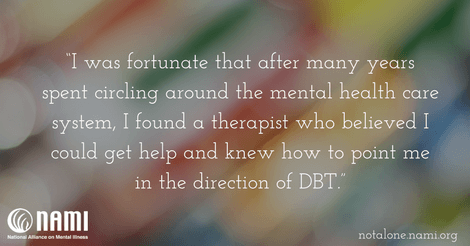 I was fortunate that after many years spent circling around the mental health care system, I found a therapist who believed I could get help and knew how to point me in the direction of DBT. I started an intensive Dialectical Behavioral Program, participated in that for just over 12 months, got set up with a new psychiatrist and was put on medications that helped with the depression, anxiety and other symptoms. The belief my therapist had in me, the tenacity that those at the DBT showed even in those times I was the most difficult to work with, the unwavering love from family and friends and my own hard work has gotten me to where I am at now. I have the skills from DBT needed to manage my emotions more effectively, better awareness of when I am slipping into relapse with my self-harm issues and I have a support system around me that now knows how to help me better when I am at my worst times and at my best.