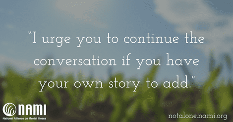 I urge you to stop labeling those suffering with mental illness as crazy. I urge you to stop stereotyping what mental illness looks like. I urge you to stop referring to suicide as selfish. I urge you to stop thinking that depression is something that can be overcome if you’re strong enough. I urge you not to tiptoe around the cause of death when someone commits suicide. I urge you to be open if you are struggling. I urge you to continue the conversation if you have your own story to add.