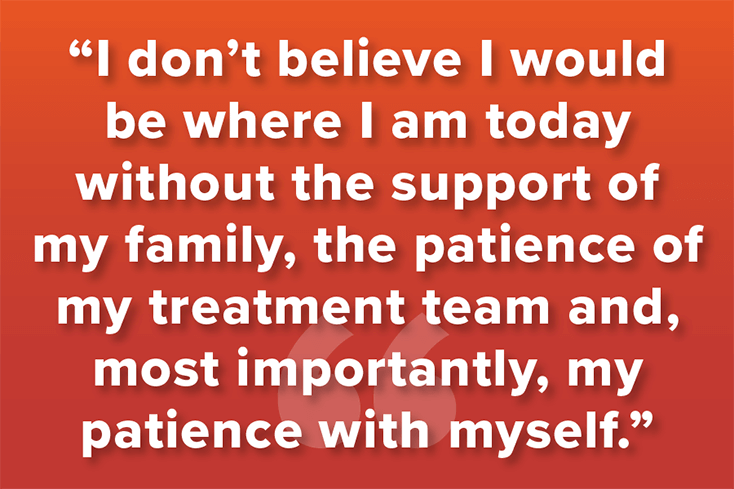 In my free time, I enjoy doing photography and spending time with my two awesome cats. I don’t believe I would be where I am today without the support of my family, the patience of my treatment team and, most importantly, my patience with myself. I will never take a day for granted after what I have been through, and I will never forget the people who helped me on my road to recovery.