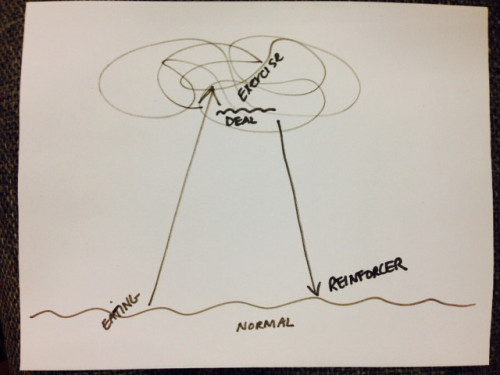 Food was my trigger. When I had to eat, my anxiety skyrocketed. The eating disorder yelled at me and said things like, “What are you doing!? You’re going to get fat if you eat that!” or, “That’s disgusting! Stop eating!” So, I would make a deal with the eating disorder. If I eat this cookie, I will do XX amount of additional exercise. Or, if I eat this burger I won’t eat dinner. The eating disorder would say OK and my anxiety would plummet. Thus, “the deal” became a powerful reinforcer for the eating disorder to continue. It was the coping mechanism for my anxiety.