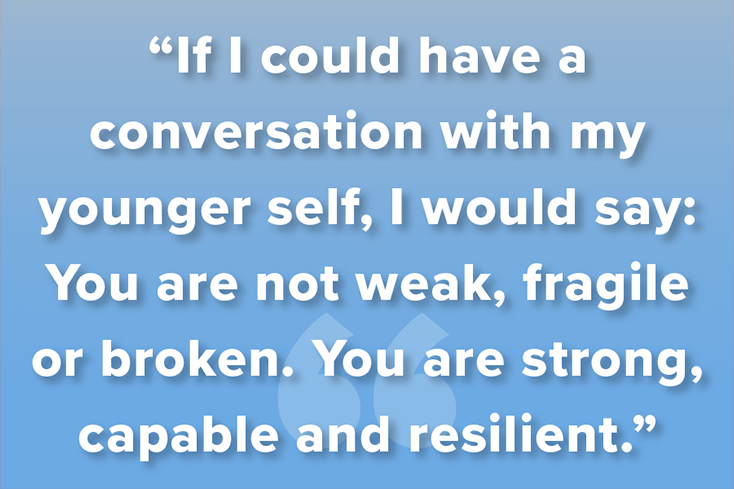 If I could have a conversation with my younger self, I would say: You are not weak, fragile or broken. You are strong, capable and resilient. You are a sensitive person who cares and feels things in a profoundly intense way — and while feeling everything all the time can be overwhelming, it has made you empathetic and compassionate to a whole new level.