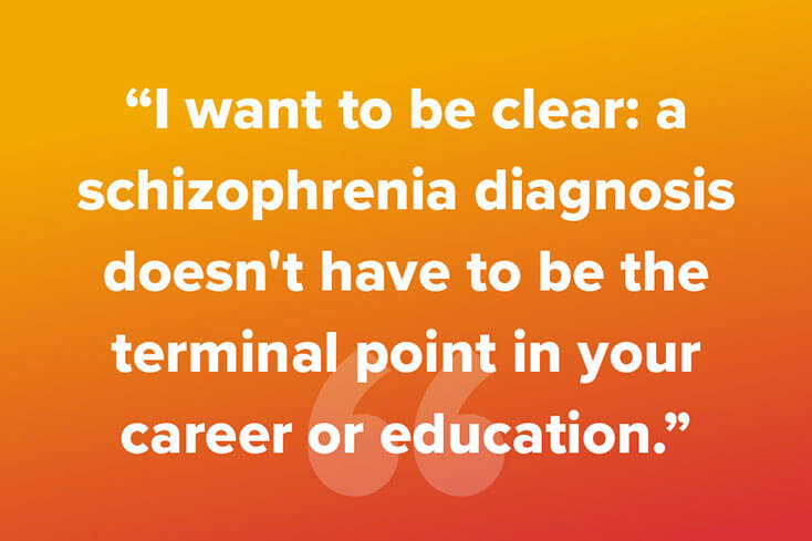 Today, I am knowledgeable and confident in my skills. But, this wasn't always the case. Schizophrenia struck me at what felt like the most inopportune time, right the peak of intellectual ability and personality development. The timing of the diagnosis was hard, and it can be difficult for many people to manage this kind of news at a critical point in their personal and professional development. But I want to be clear: a schizophrenia diagnosis doesn't have to be the terminal point in your career or education.
