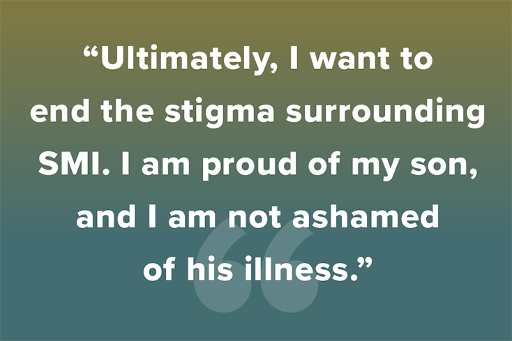 Ultimately, I want to end the stigma surrounding SMI; I am proud of my son! I am not ashamed of his illness, and if we could spread accurate information about this illness, it would no longer be taboo. I hope those who are in a similar situation will join me as we spread awareness and turn passion into action.