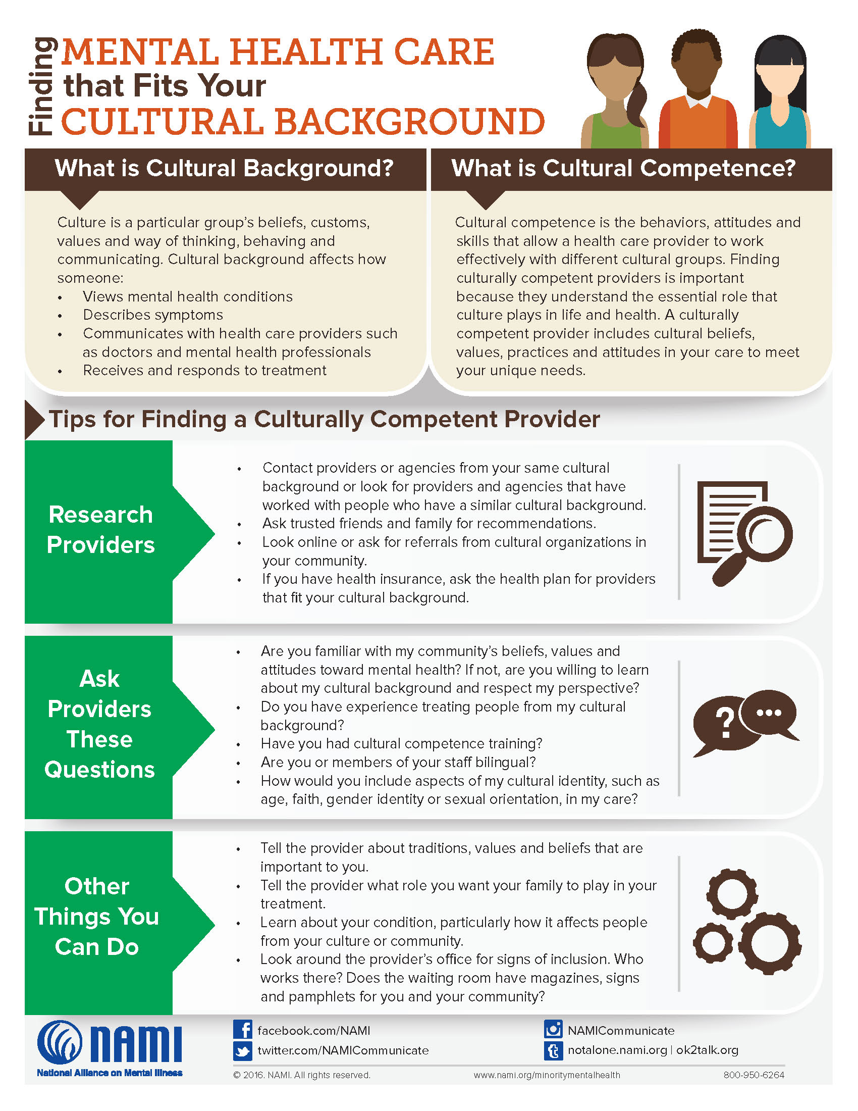 • Are you familiar with my community’s beliefs, values and attitudes toward mental health? If not, are you willing to learn about my cultural background and respect my perspective?